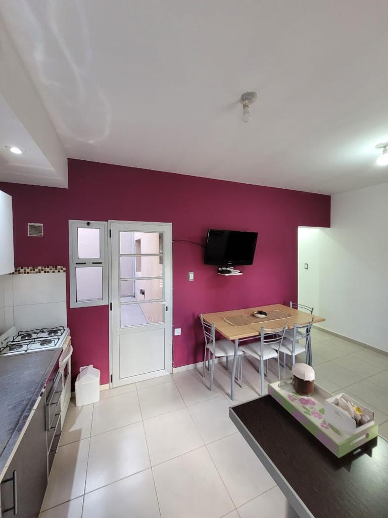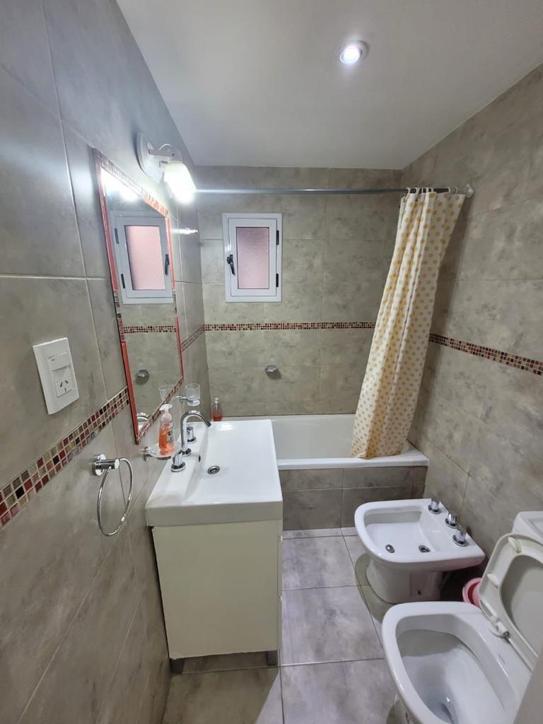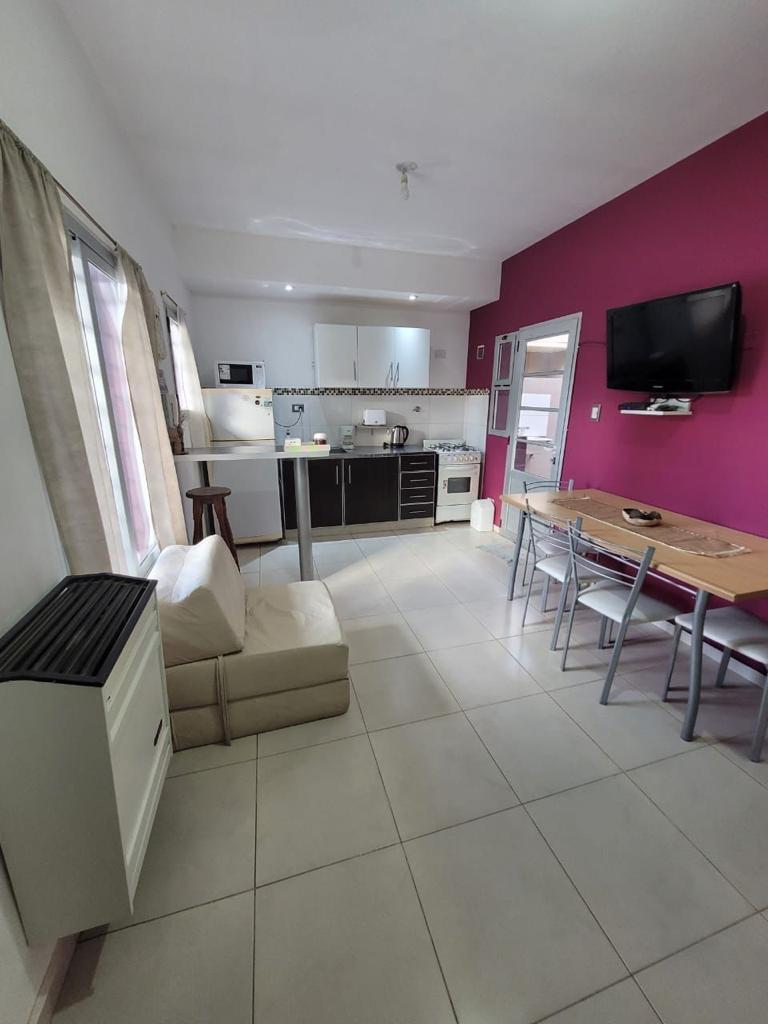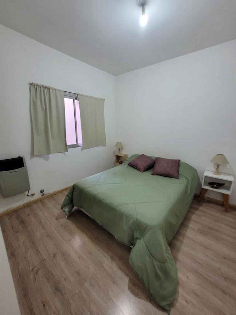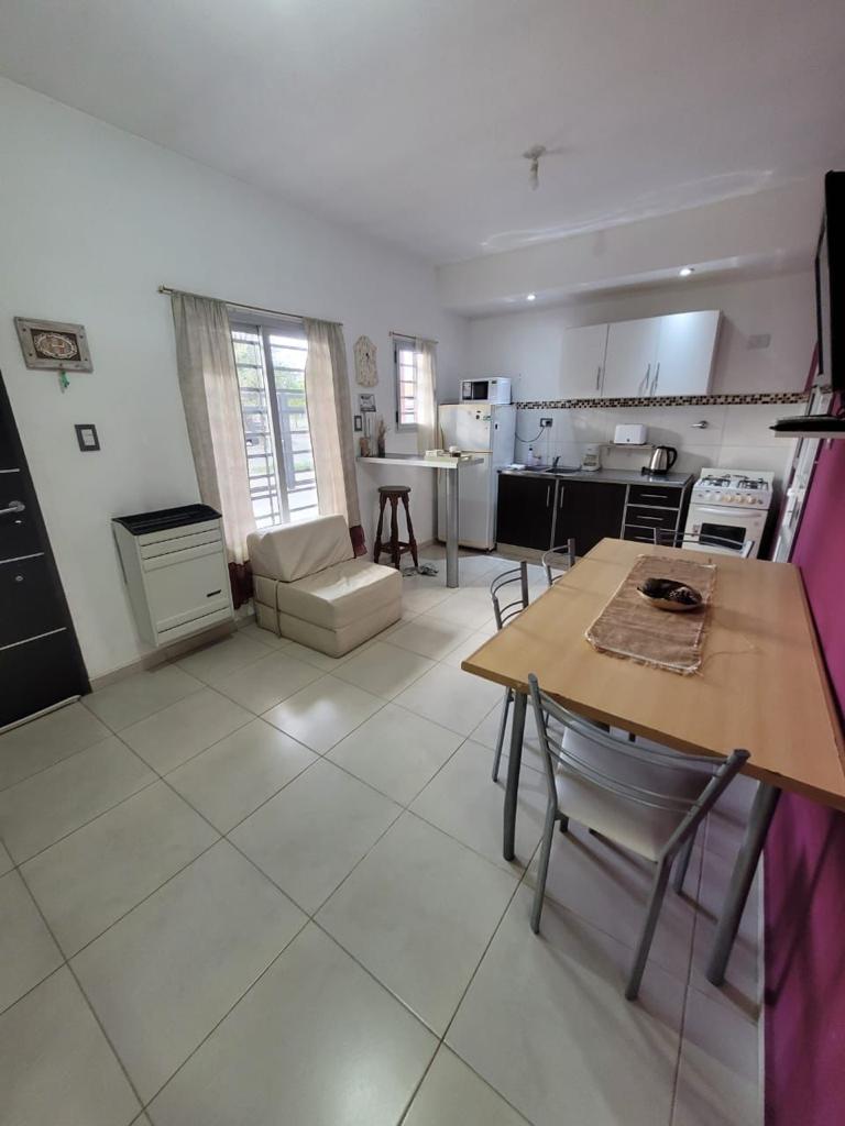 El dormitorio principal tiene una cama Queen (que pueden ser 2 camas de 1 plaza y media), un amplio placard, con una ventana que hace al ambiente muy luminoso y un calefactor. El living comedor tiene mesa con sus sillas, TV de 32” con paquete premium DirecTV, un práctico desayunador y un ventanal que da a la calle. La cocina, integrada al comedor, está totalmente equipada. Tiene microondas, heladera con frizer, cafetera y tostadora eléctrica. Este espacio tiene un calefactor. Desde allí se accede a un pequeño patio de aire y luz